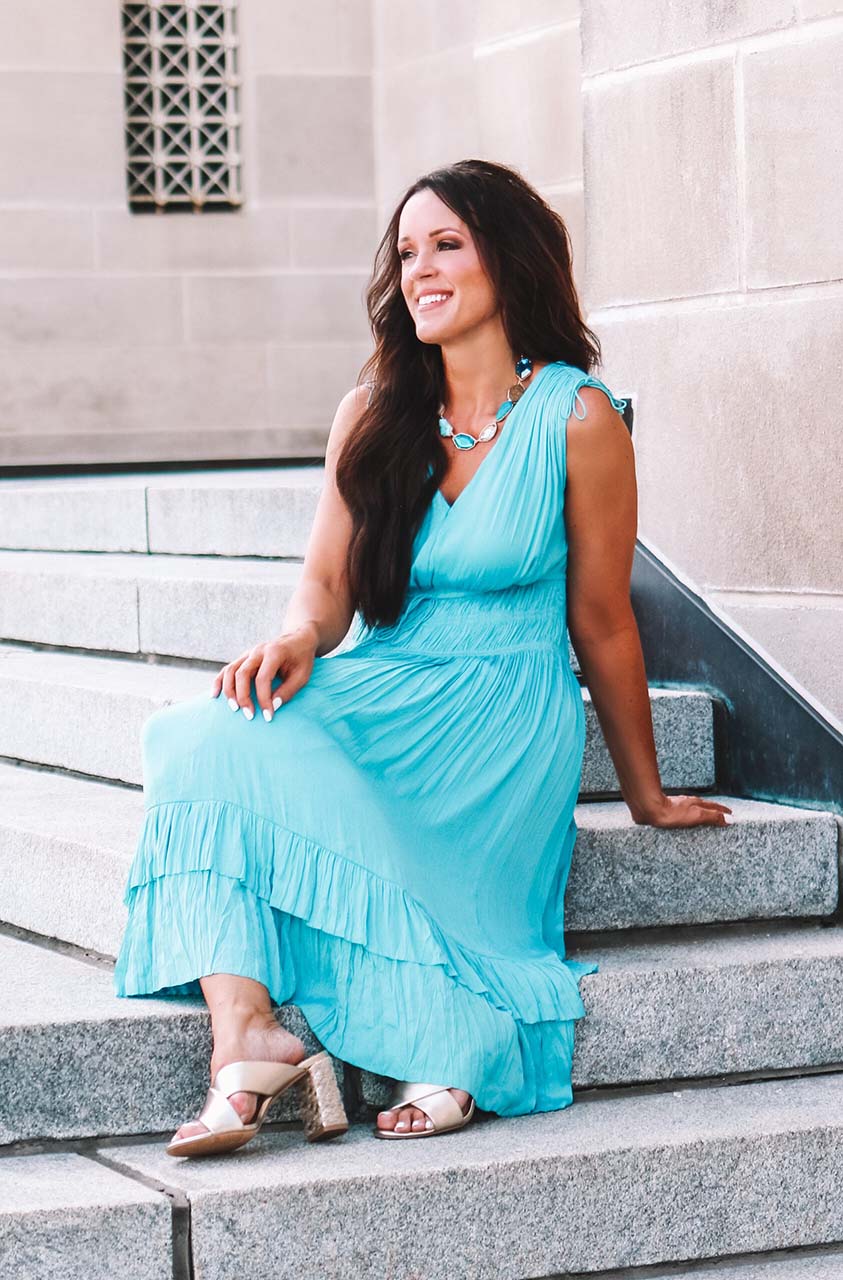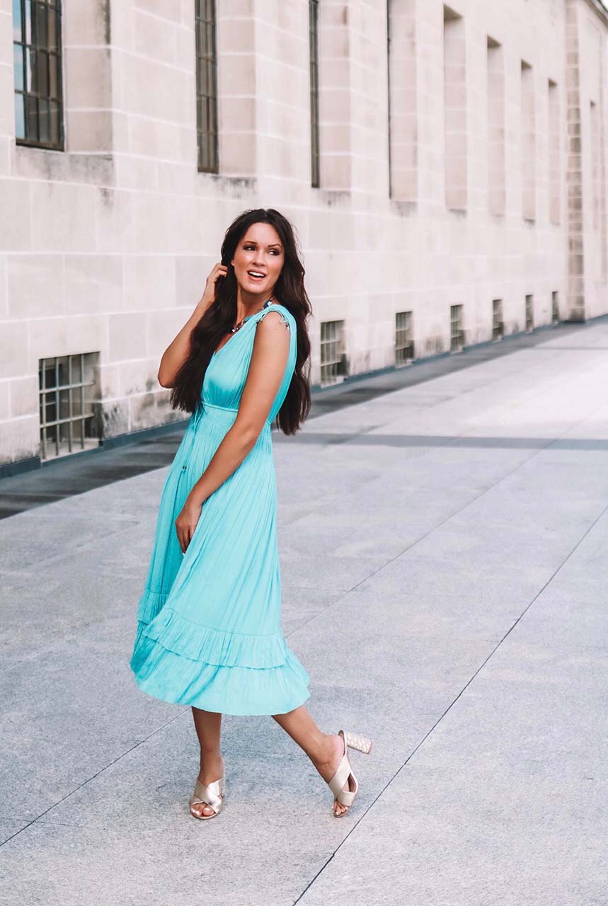 While I typically gravitate to neutrals, this Pleated Dress in Mykonos Blue has my heart! Not only is the color absolutely stunning, the fit and feel are perfect for any summer event (weddings, showers, church, and more!). Adding in the stunning Turquoise Patina Statement Necklace and Metallic Espadrille Heels, I truly felt like a Greek Goddess!