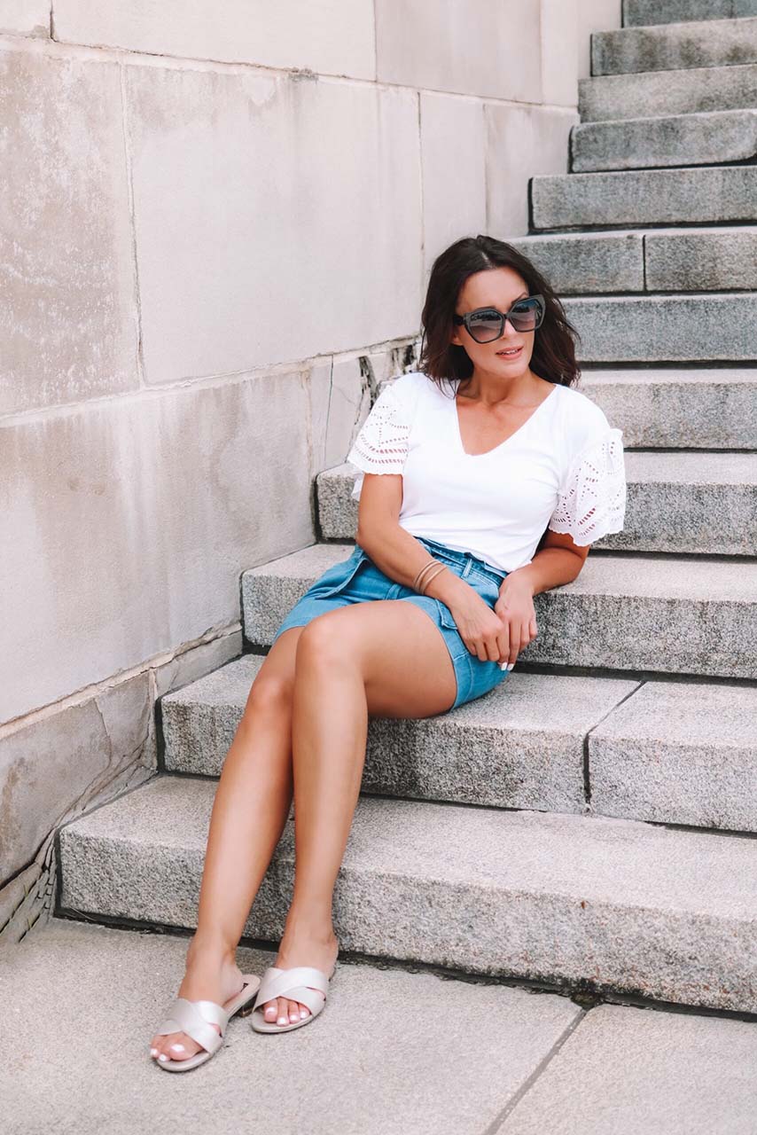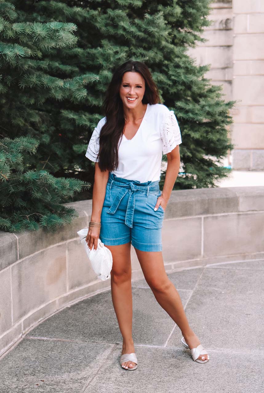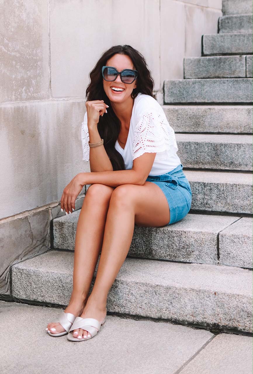A comfy pair of shorts is a must during the hot summer months. But if you are anything like me, you may struggle to find shorts that are both lightweight but still cute and girly. These High-Rise Denim Shorts feature my favorite Tencel fabric and check all of the boxes for a perfect pair of shorts (hello, stretch!). And the Eyelet Flutter Sleeve Tee has all the feminine vibes and would easily pair with pants or your favorite pair of denim or even a midi skirt as the temps cool down. I completed the look with these Metallic Slides and Oversized Sunglasses that are so stylish and affordable. This look is comfy, cool, and perfect for a summer day on the go!