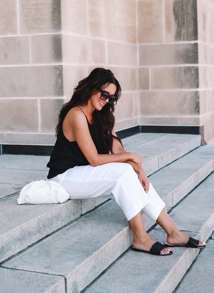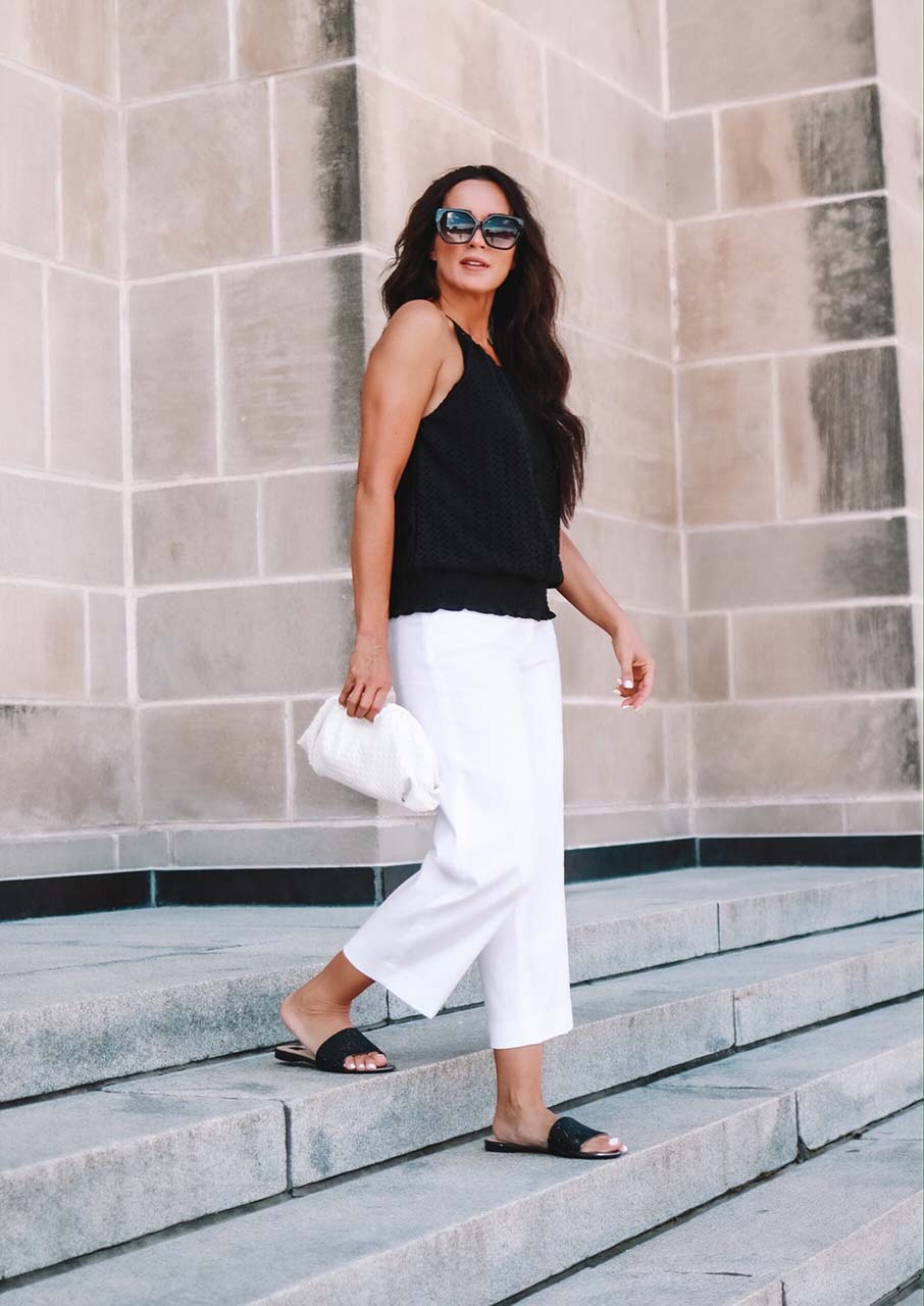 For me, a high contrast pairing will always be high on my list for an effortless and classy look. You can never go wrong when you pair black and white together. I will forever be a fan of the halter neck style featured in this Eyelet Halter Top. It is fun, flirty, and universally flattering on so many body types. Paired with the Linen Wide-leg Crop Pants, this look will have you date-night ready. The versatility of a good white pair of pants cannot be overstated. They will span the seasons for you! I finished the look with the Jewel Band Flats and Textured Crossbody Clutch. You will have these on repeat, I promise!
