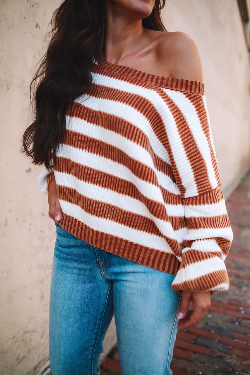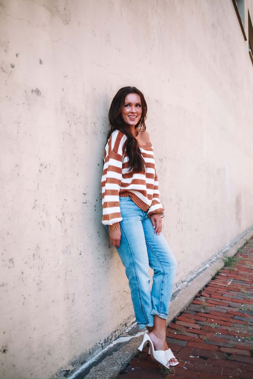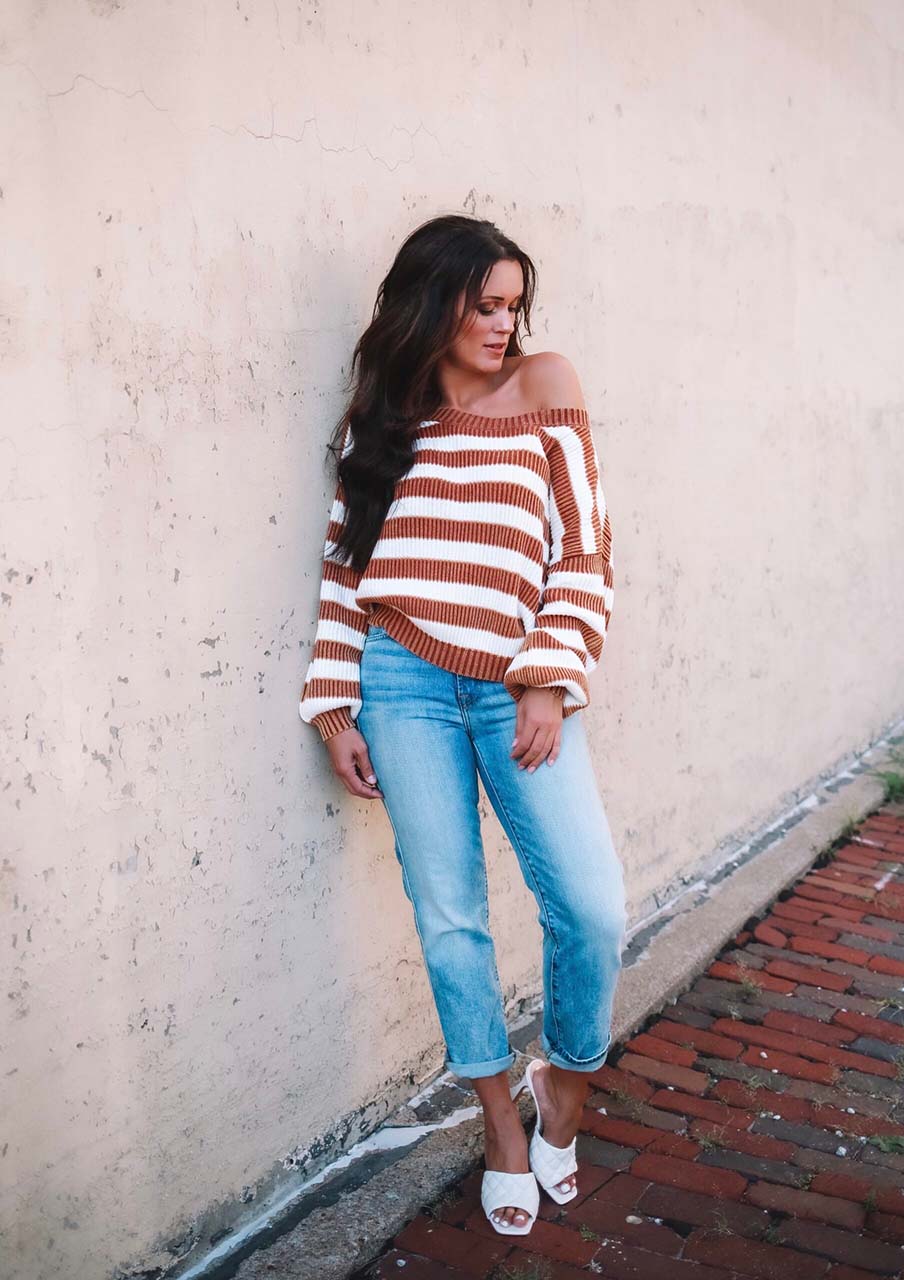 This sweater just screams fall, doesn’t it? I instantly fell in love with the rust and cream stripes. The Olivia Striped Sweater has such a great casual vibe, but I LOVED wearing it off-the-shoulder. Paired with this straight cropped denim and my favorite white heel, you are date-night ready! But I love the idea of throwing on some joggers for a cozy and comfy look.