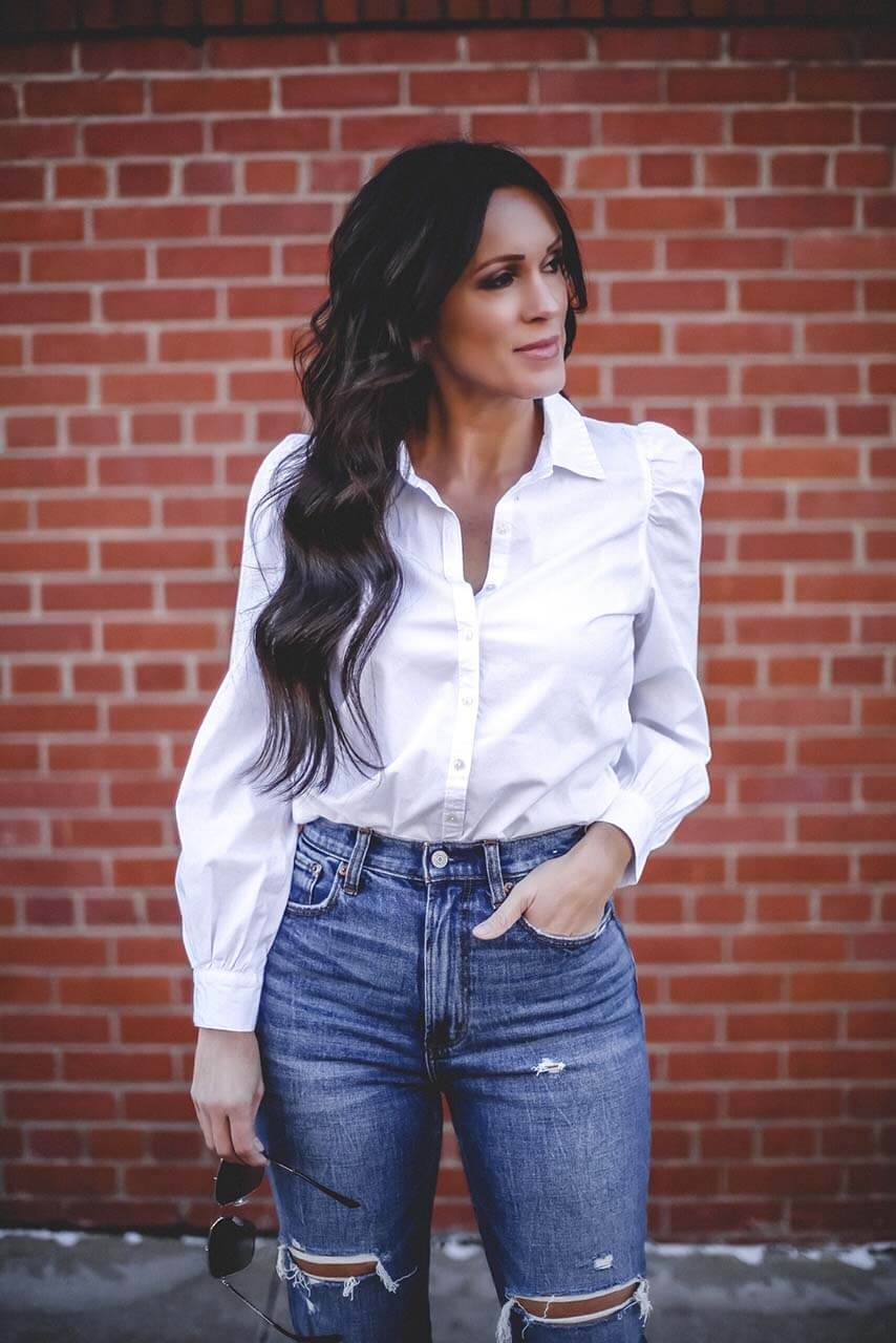 Like I mentioned, I am a huge fan of bodysuits. And this Long-sleeve Poplin Bodysuit gives me all the feels. A little different from your standard bodysuit, this one gives the illusion of a white button-down shirt. But it stays perfectly tucked in….bonus! This classic look will pair with any denim of your choice, but I loved how it came together with this year’s hottest style of jeans, the straight crop.