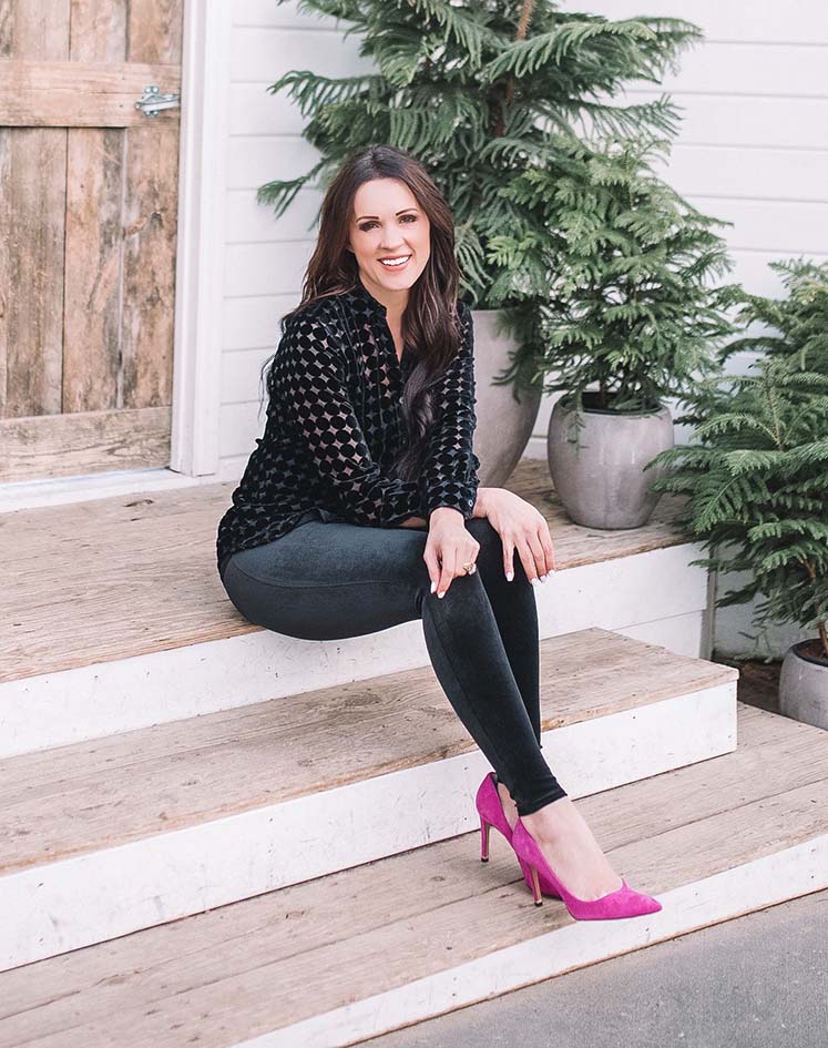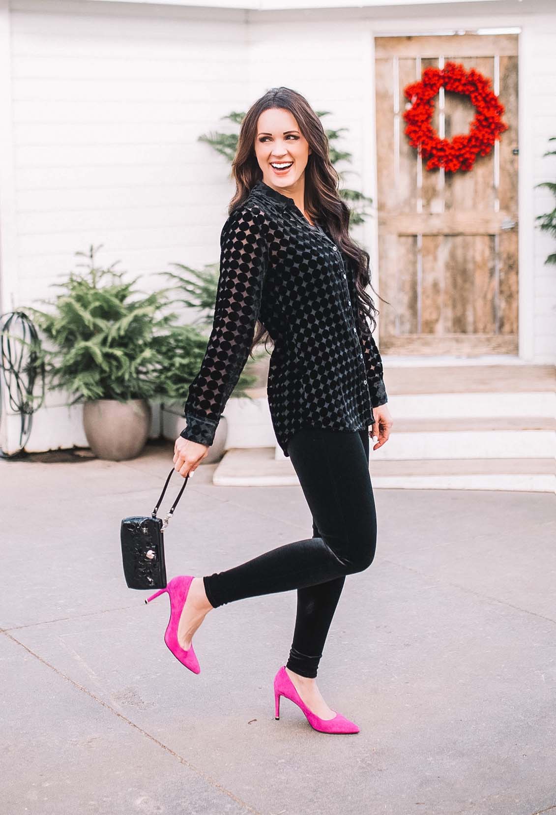 First up, I paired my new best velvet friend with my also-favorite velvet leggings. It’s such an easy and comfy look with so much possibility. I do suggest keeping the leggings on the dressier side (such as a pair of Spanx leggings). I popped a little color with a hot pink heel, and voila! You are ready for that date night you have been waiting for or the office meeting (even if you may be dreading that one!).