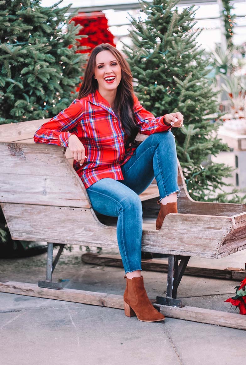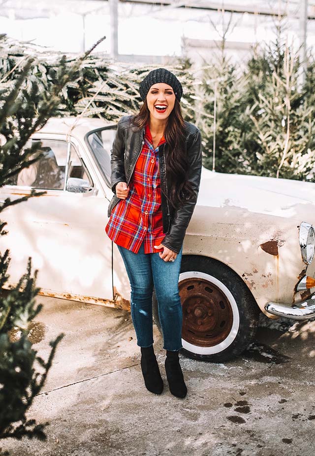 And finally, here is where classic meets edge! I layered the Pandora Wrinkle-Free Emerson Tartan Tunic with a distressed leather jacket, knit beanie, and sock booties to give it a super “cool” vibe. You could even throw on some over-the-knee boots to really take this look up a notch! I love that this same top can give you three completely different looks. A top this versatile needs to be in your closet!
