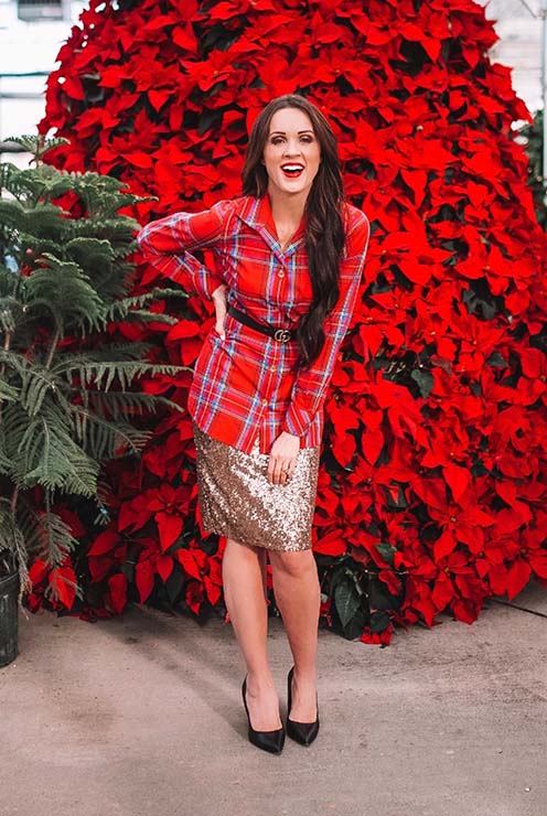 Up next is a little holiday glam! I am breaking all the rules and pairing the Pandora Wrinkle-Free Emerson Tartan Tunic with a gold sequin skirt. Who made these rules, anyway?? The longer length of the tunic makes it perfect to add a belt (which gives you a great little waistline, by the way!). Throw on a basic heel, and you are all set for those dressier holiday parties!