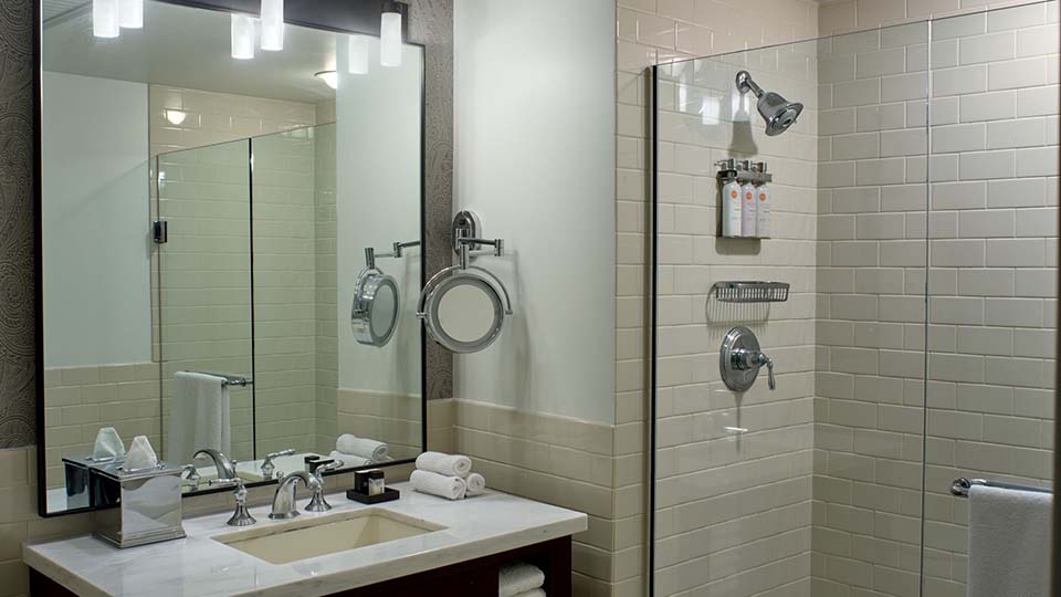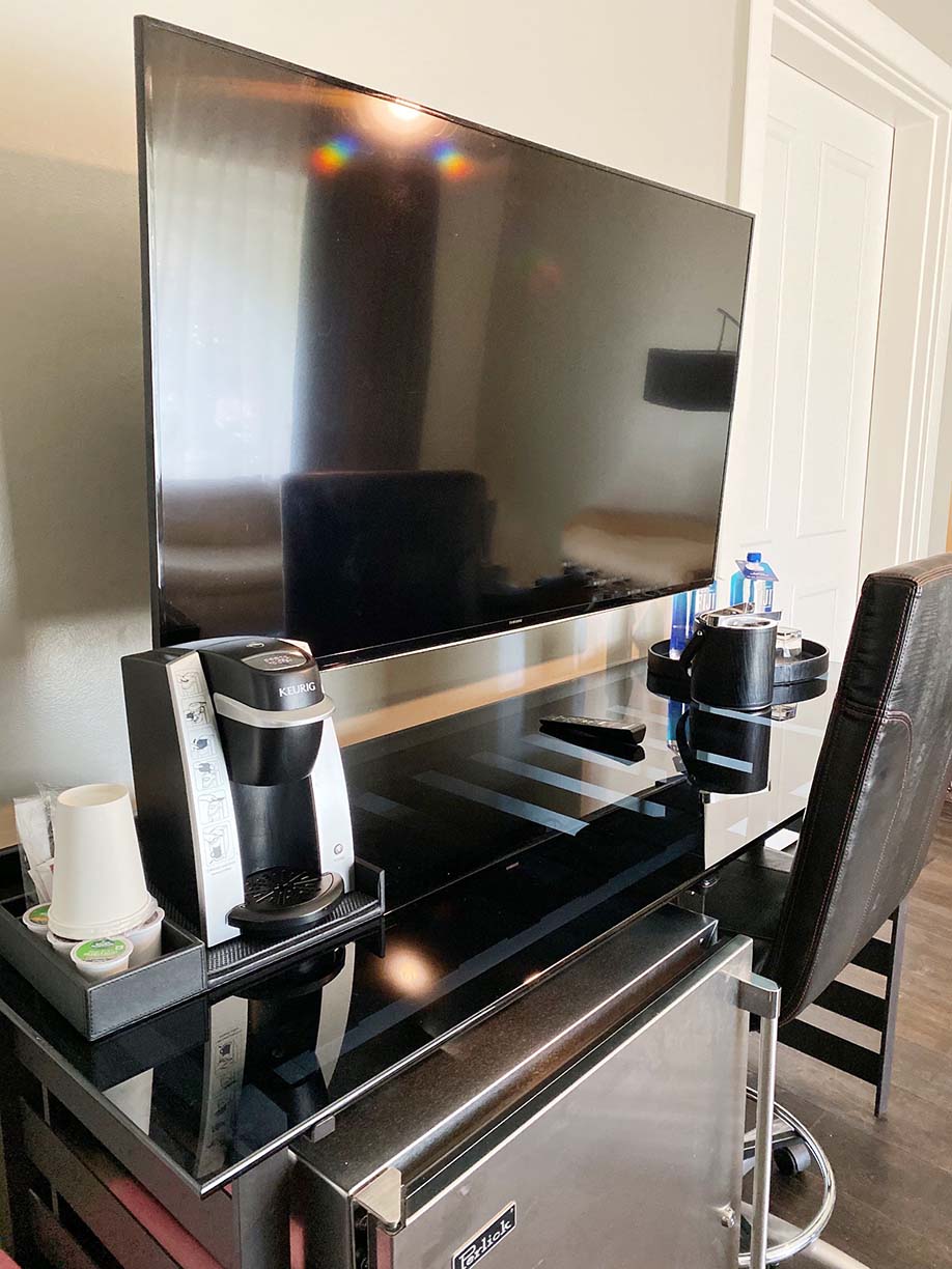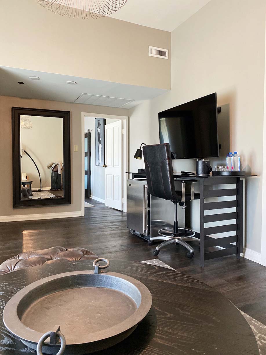 The Crescendo Suite offers a gorgeous and modern sectional couch paired with tufted ottomans and rich wood coffee table. A full-sized desk is available for any work space you might need. Don’t forget the large-screen television and Keurig! The Crescendo suite also featured two bathrooms, a plus for any hotel suite. You truly feel like you are at your home away from home!