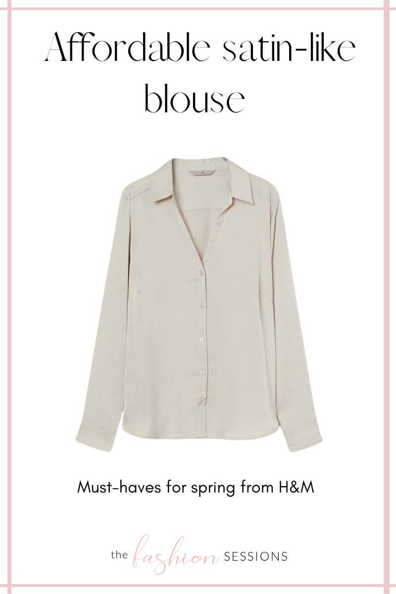 The buy of the season at H&M is this gem right here, a gorgeous satin-like blouse. While it comes in several color options, this neutral beige shade can stand on its own with a great pair of jeans or could just as easily be layered for an elegant pairing. What size you choose will depend on the fit you prefer. I went with a medium. At only $17.99, you will not find a better buy at H&M this spring!
