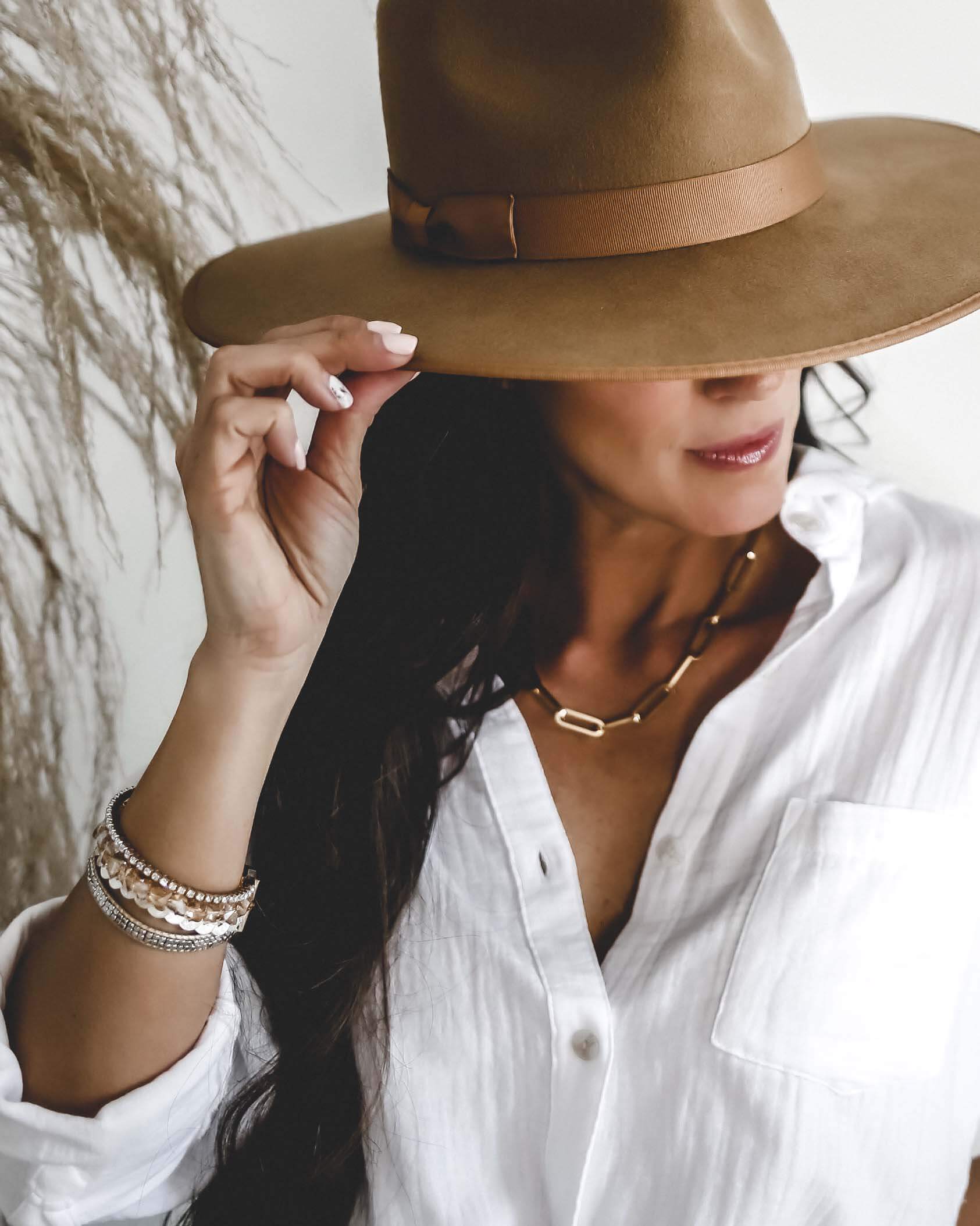 I love the more understated Flyaway Wrap shown here (only $25). Paired with the simple but beautiful Paperclip Gold Necklace (seriously one I reach for daily and only $39!), these two make a great pair.